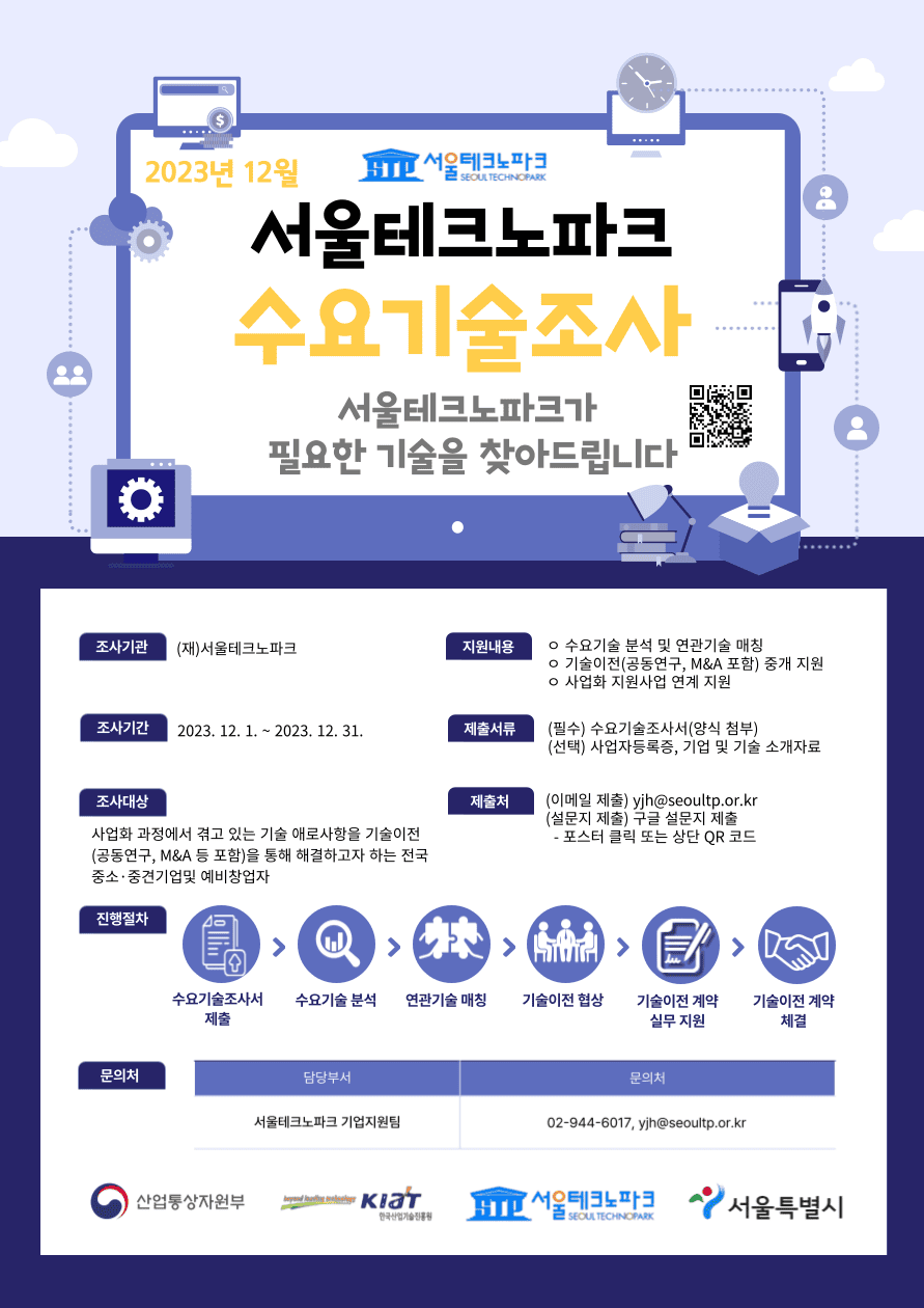 (재)서울테크노파크는 기업과 예비창업자가 보유한 기술 애로사항을 파악하여 맞춤형 지원을 제공하기 위해 수요기술조사를 아래와 같이 진행하오니 기술사업화 과정에서 어려움을 겪고 있는 전국 기업 및 예비창업자의 많은 참여 바랍니다. 조사개요 □ 조 사 명: 2023년 12월 서울테크노파크 수요기술조사 □ 조사기관: (재)서울테크노파크 □ 조사방법: 온라인 수요기술조사 □ 조사기간: 2023. 12. 1. ~ 2023. 12. 31. □ 조사대상: 사업화 과정에서 겪고 있는 기술 애로사항을 1)기술이전(공동연 구, M&A 등 포함)을 통해 해결하고자 하는 전국 기업 및 예비창업자 □ 지원내용 : 서울테크노파크의 기술이전·사업화 네트워크를 활용하여 기술 이전(공동연구, M&A 등 포함) 중개 및 사업화 지원사업 연계 지원 추진절차 추진 절차 내용 비고 신청/접수 기업 및 예비창업자의 수요기술 제출 기업 및 예비창업자 ▼ 수요기술 분석 서울TP 내·외부 전문인력의 수요기술 분석 서울TP, 유관기관 ▼ 연관기술 탐색 전국 단위 네트워크를 활용한 연관기술 탐색 서울TP, 유관기관 ▼ 연관기술 매칭 사업화, 기술 단계 등을 고려한 연관기술 매칭 서울TP, 유관기관 ▼ 기술이전 지원 기술이전 실무지원(협상, 계약서 작성 등) 서울TP, 유관기관 ▼ 기술이전 완료 수요-공급기술 기술이전 완료 수요-공급기업/서울TP 1) 별첨(3페이지) 참고 세부 지원내용 □ 수요기술 분석 및 연관기술 매칭 ㅇ 제출한 수요기술조사서 기반 서울TP 내·외부 전문인력의 수요기술 분석 (수요기술의 구체화가 필요한 경우 온·오프라인 수요기술 미팅 진행) ㅇ 기업(또는 예비창업자)의 사업 분야, 기술성숙도2), R&D 역량 등을 고려 하여 전국 대학/출연연 보유 연관기술(기술리스트 제공) 및 연구실 매칭 □ 기술이전(공동연구, M&A 등 포함) 중개 실무 지원 ㅇ 기술이전 협상 및 기술이전 계약서 작성 등 기술이전 실무 지원 ㅇ 기술거래, 연구개발, 사업화, M&A 전문기관 및 전문가 연계 지원 □ 사업화 지원사업 연계(해당 시) ㅇ 서울테크노파크 자체 지원사업 연계(사업 선정 시) ㅇ 타 기관에서 운영하고 있는 사업화 지원사업 연계 지원 제출서류 □ 필수 제출서류 ㅇ (방법1) E-MAIL(yjh@seoultp.or.kr) 제출 - 수요기술조사서(양식 첨부) ㅇ (방법2) 구글 설문지 제출 - https://forms.gle/1KSX4GzJXzehkbJ8A □ 선택 제출서류 ㅇ 사업자등록증, 기업 및 기술 소개자료 제출방법 담당 부서 담당자 이메일 문의 연락처 (재)서울테크노파크 기업지원팀 윤종호 주임 yjh@seoultp.or.kr 02-944-6017, 6035